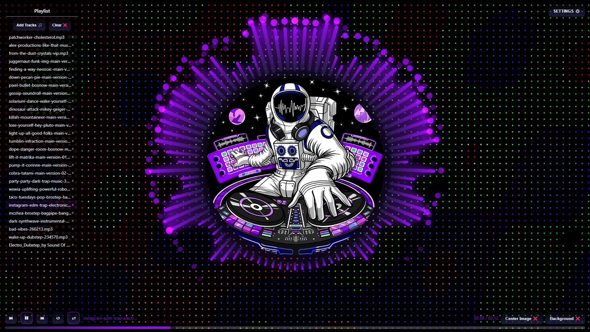 A reactive, center-punch audio visualizer for the browser. Drop in tracks, pick a theme, add a cover image or backdrop, and watch beats explode into bars, sparks, and glow. Great for streams, party displays, or just vibing.