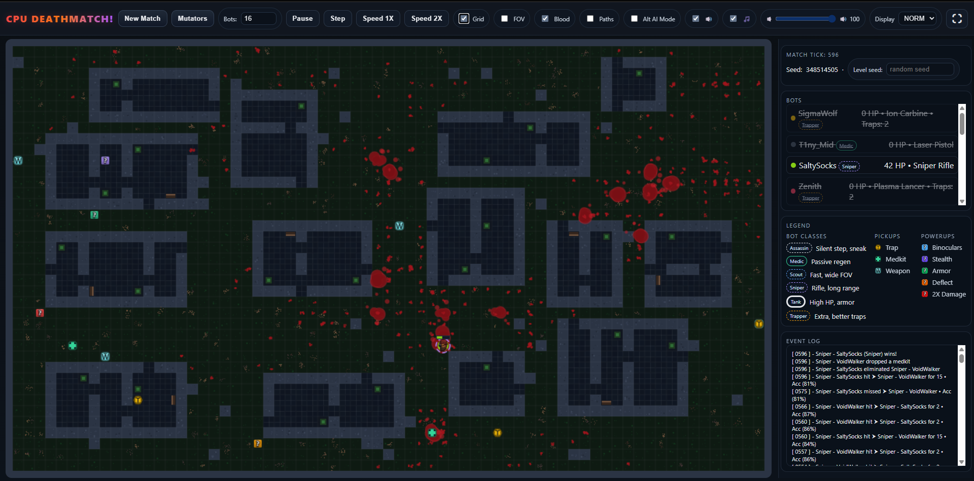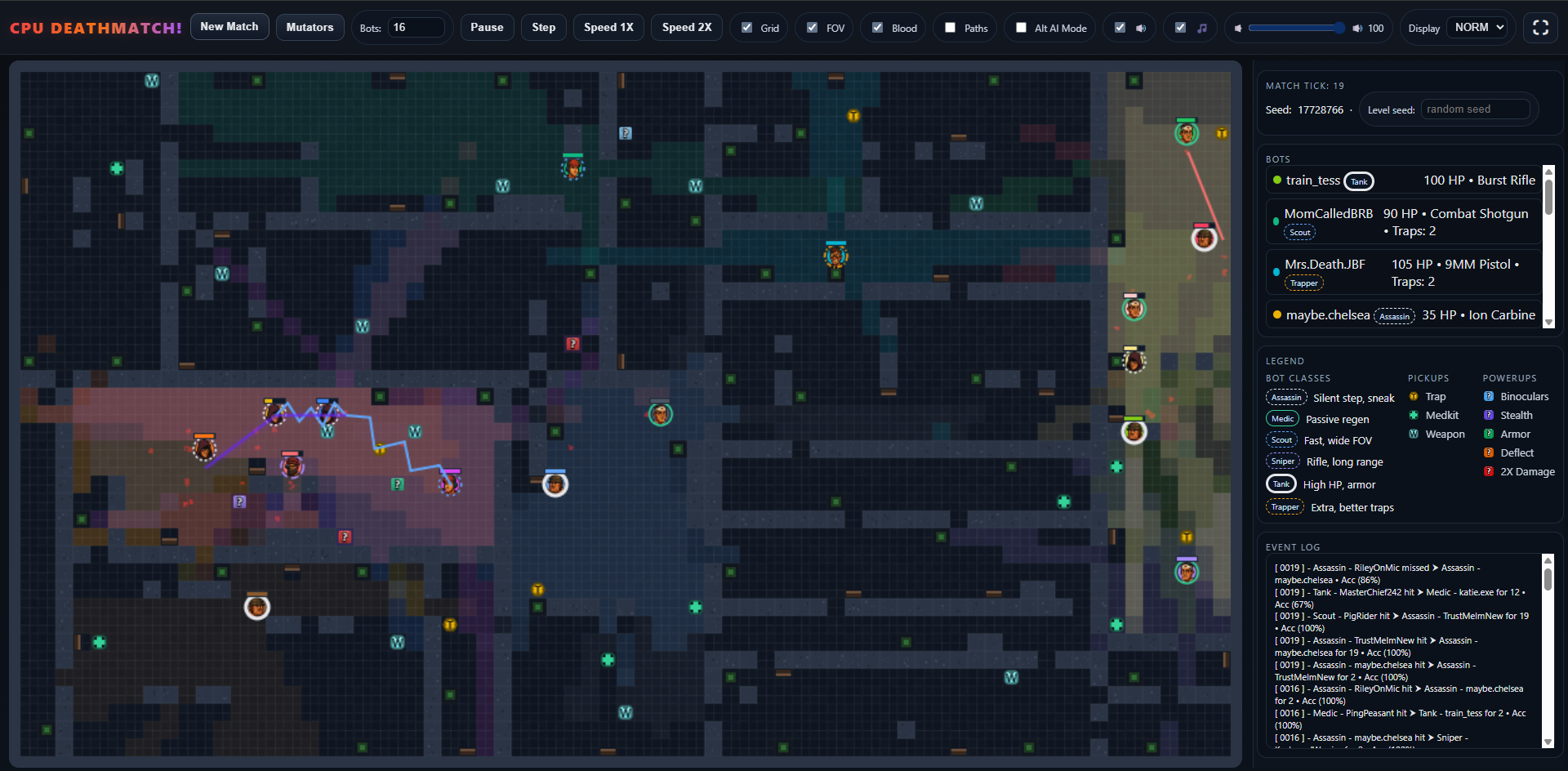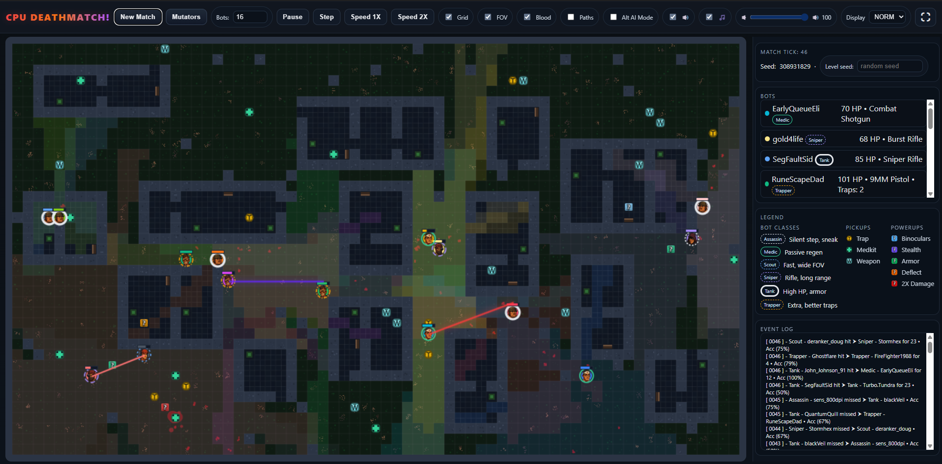 - Spectator tools: Live Event Log, bot list with class badges, and an optional grid/FOV overlay to see how the AI “thinks.”