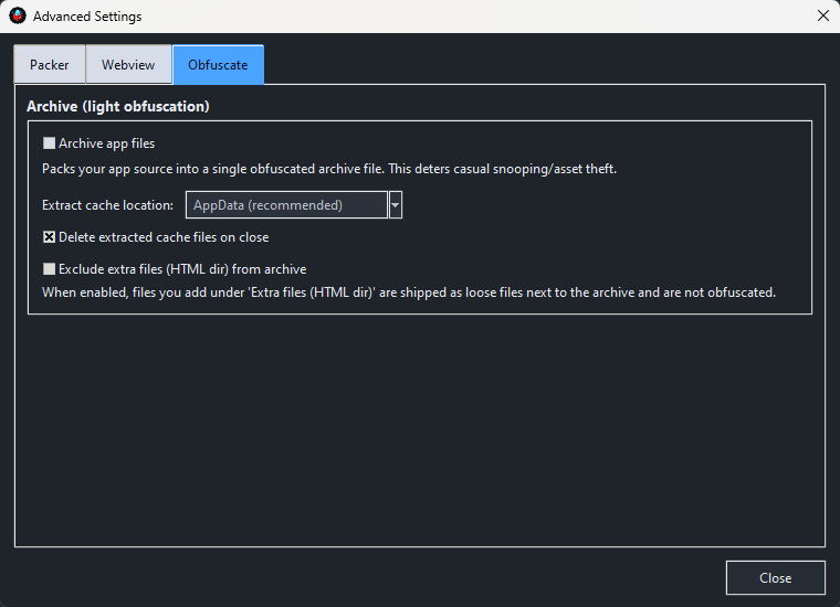Optional Obfuscate/Archive (Advanced): packs web content into a custom archive to deter casual extraction (deterrent, not encryption/DRM).