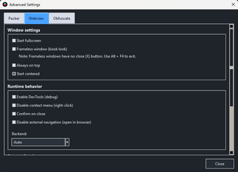 Basic + Advanced settings: window sizing, resizable, fullscreen, frameless/kiosk mode, always-on-top, start centered, DevTools toggle, context menu toggle, external link handling, storage/privacy modes, and more.