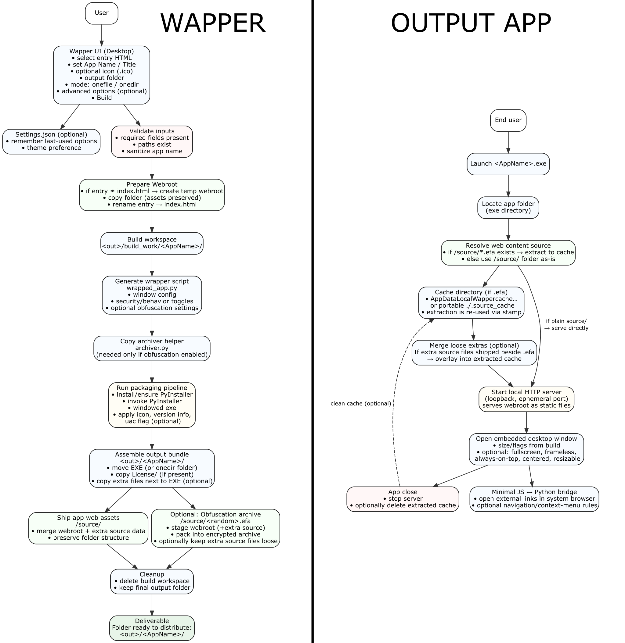 Desktop capability: Wapper runs as a Windows desktop app hosting a webview with a local Python-backed wrapper/server, enabling native-style workflows when used - for example file import/export, reading/writing local files your app manages, local background tasks/endpoints, and richer offline/local behavior than a typical browser-based install.